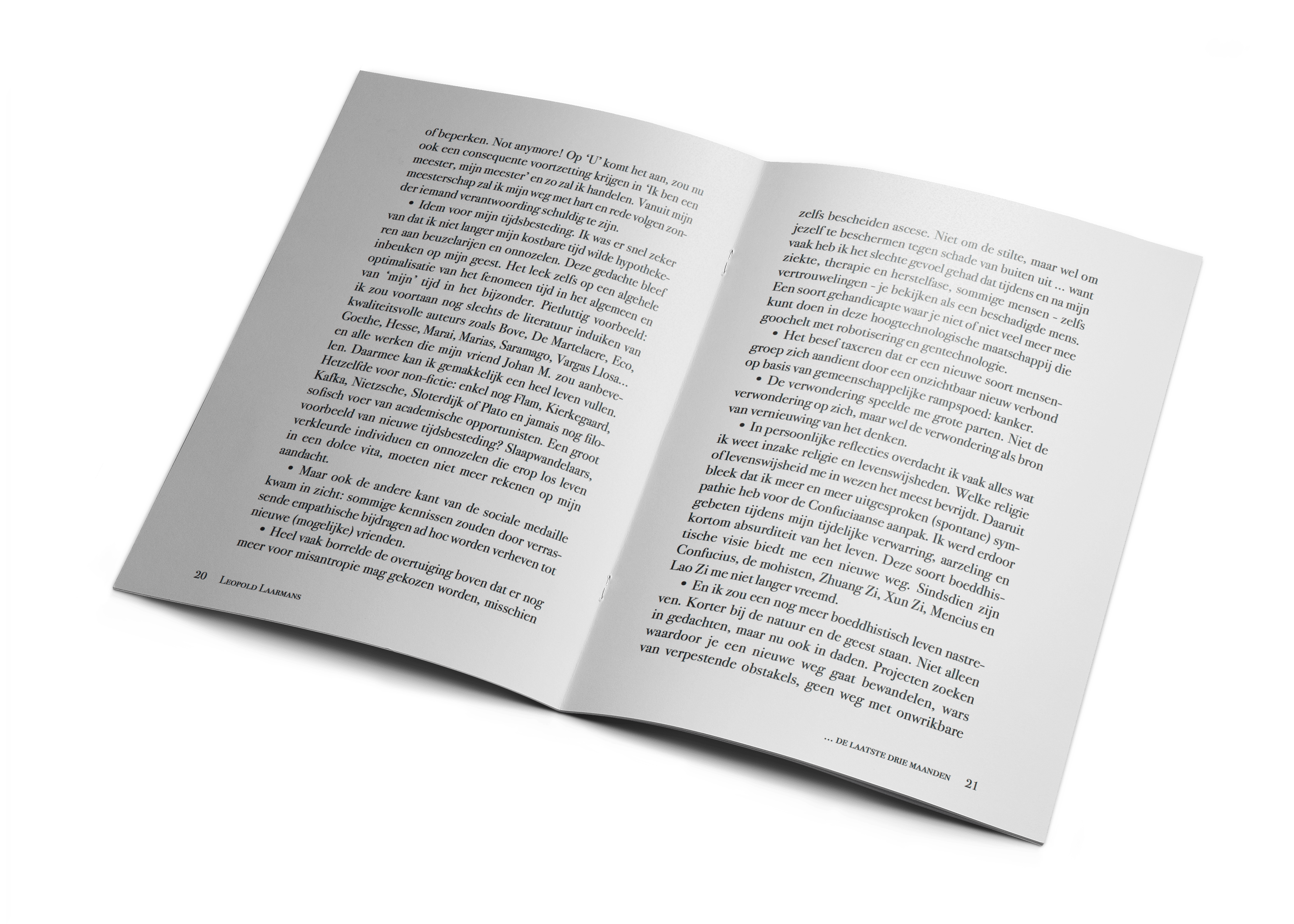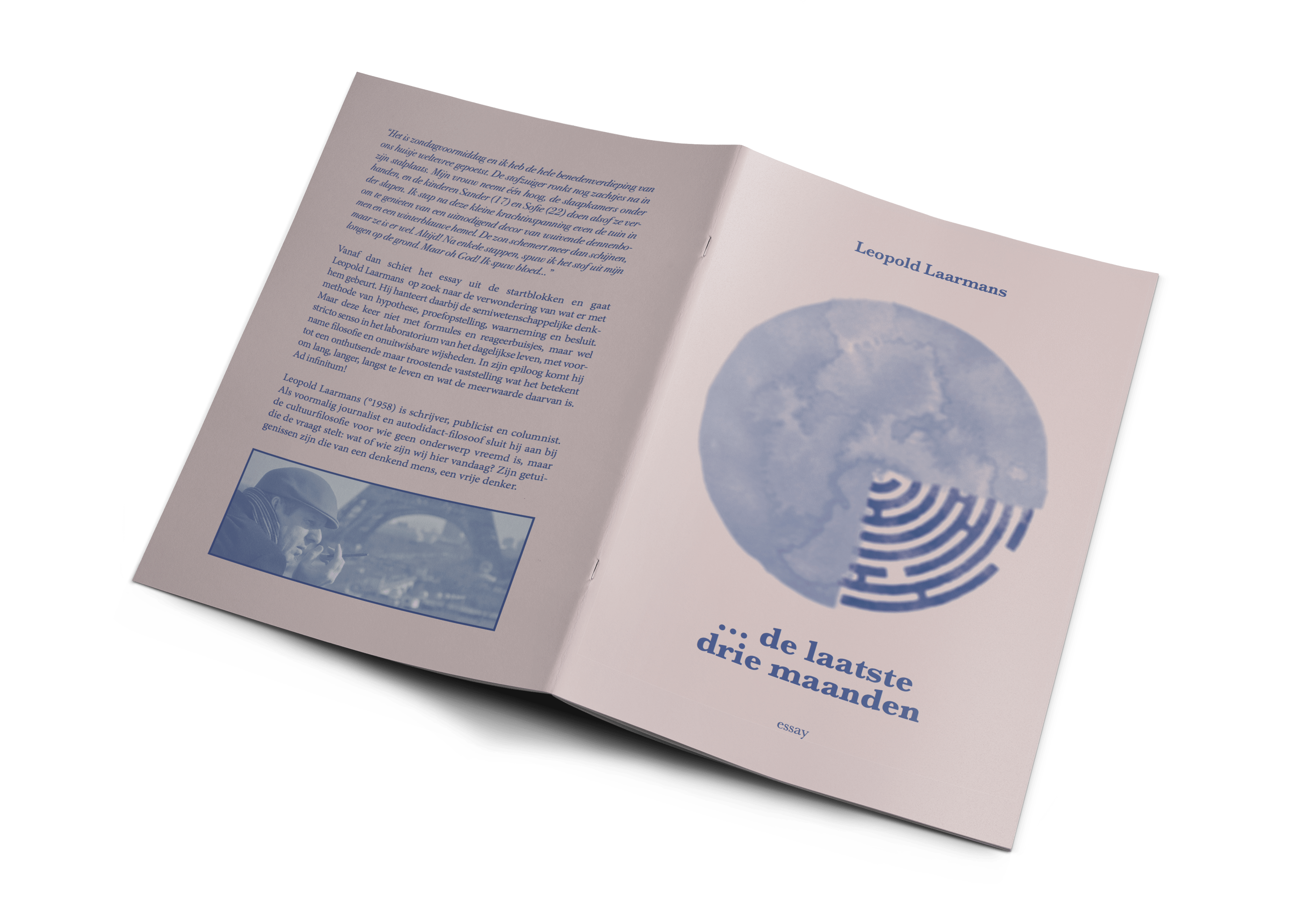Het essay is met vreugdevolle liefde geschreven, in alle redelijkheid en recht uit het hart. Het is een warme aanmoediging om het leven en de dood als één geheel te zien. Als zogeheten twee handen op één buik. Het leven en de dood als een cyclus van ontstaan en eindigen te zien als verwondering. Of zachter uitgedrukt: het beëindigen wat is ontstaan. Dood gaan hoeft niet perse een drama te zijn, hoe ontzettend erg afscheid van geliefden nemen ook is. Het mag gewoon geen tergende tragedie zijn, want het leven - micro-macro - toont ons in het dagelijkse leven voortdurend ontelbare metaforen aan van leven en dood. Het is de voortdurende weg van de bron naar de zee, van het oplaaiende leven op aarde en het uitdoven ervan. Wanneer straks de oerknal is ontmaskerd, zullen we de opperbouwmeester van het heelal kennen. Maar zelfs die ongelooflijke ontdekking zal het aardse concept van de natuur op aarde, fauna en flora ad infinitum, nooit veranderen, want de natuur is de natuur en mensen zijn daar onlosmakelijk deelgenoot van. Neem een willekeurige bloem, een witte roos. Van een zaadje opgegroeid tot een toverachtige flora fee vol krachtige schoonheid met geuren en kleuren. Om na een tijdje zonder protest te verwelken. Van groeien over weelderig bloeien tot nederig verflensen. Net zoals het heelal. Voor zover Stephen Hawking weet, is die kosmos ontstaan door de oerknal. De geniale Hubble zoekt nu de lichtende weg terug naar de ultieme bron van die hypothetische superknal als mogelijke ontstaans-anomalie. Heel waarschijnlijk zal de uitkomst van de zoektocht eenvoudig zijn. Zo simpel als Einstein ooit dromend bedacht dat E = MC2. Dit essay moet het dramagehalte van de dood verlagen. Aanvaardbaar maken. Troostbaar. Het leed dat mensen die ermee te maken hebben, verzachten. De smart relativeren. Het verdriet de best mogelijke memento mori aanreiken. Gewoon omdat iedereen vroeg of laat, door ziekte of door ouderdom, plots of aangekondigd, op een dag of op een nacht... het kritische punt van onomkeerbaarheid zal bereiken. We kunnen nooit zeggen dat we het niet geweten hebben. De dood is zo menselijk als het leven zelf: menselijk al te menselijk! Het essay is mijn persoonlijke getuigenis van een beleden rampspoed in 2016. Ik wil mijn jammerlijke belijdenis graag met de lezer delen. Niet als proza zondermeer, maar als vrijblijvende troost en steun voor als het fatum ooit langskomt. Kortbij of iets verder weg. Maar zonder meer ooit en altijd! Nolens volens. En daarom is dit essay misschien geen essay, maar wel een manifest van het leven. Ik wens je tijdens het lezen een verwonderende leestijd toe, Leopold Laarmans